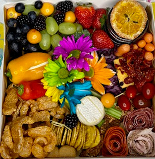 Assorted salami & pepperoni, chicken, assorted fruits; assorted vegetables; assorted KETO cookies, KETO protein bar, KETO baked pork rinds, olives, assorted cheeses; Wine or Champagne Split