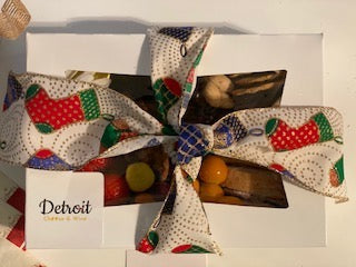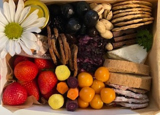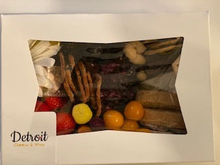 Assorted seasonal fruit and vegetables, assorted cheeses, crackers, spread, nuts (in container) and/or pistachios, chocolate; Wine or Champagne Split