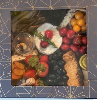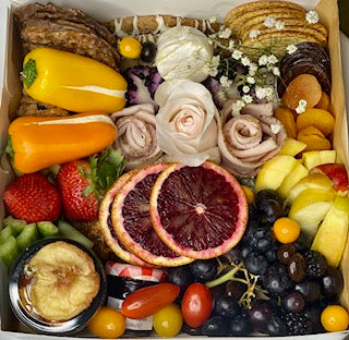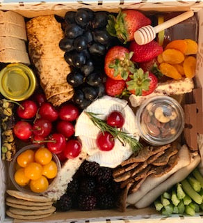 Chicken, turkey, assorted fresh and dried fruits, nuts, assorted crackers, wafers, chips, assorted vegetables, olives, jam, assorted crackers, biscuits, chips, assorted cheeses, assorted cookies and chocolates; Wine or Champagne Split